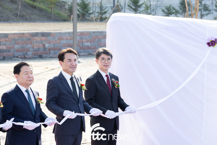 ▲ (왼쪽부터)윤석대 한국수자원공사 사장, 김진태 강원특별자치도지사, 김완섭 환경부 장관이 원주천댐 준공기념비를 제막하고 있다(사진=환경부 제공) |