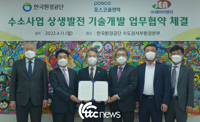 | ▲ 한국환경공단 안병옥 이사장(사진 왼쪽에서 세 번째)이 11일 ㈜포스코플랜텍 김복태 대표, ㈜제아이엔지 박인규 대표와 수소 충전 기술개발 협약을 체결한 후 기념촬영하고 있다.(사진=한국환경공단 제공) |