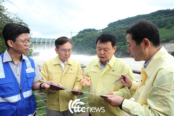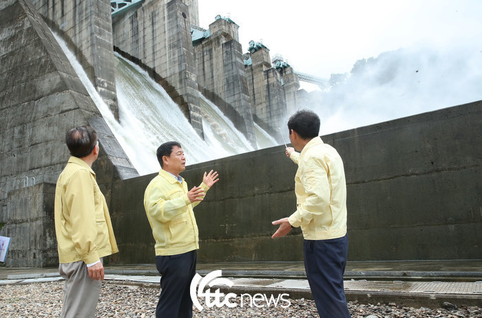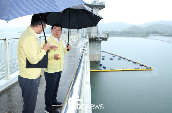 | ▲ 한국수자원공사 윤석대(오른쪽) 사장이 18일 용담댐 홍수대응 현장을 긴급 점검하고 있다.(사진=한국수자원공사 제공) |