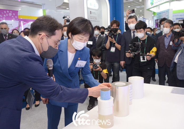 | ▲ 8일 ‘제43회 국제환경 산업기술.그린에너지전(엔벡스 2022)’에서 한화진 환경부 장관(오른쪽)이 수소 누출시 변색 및 전기식 신호 발생으로 폭발 및 환경오염을 사전에 확인하여 솔루션을 확보할 수 있는 수소검지 비색센서 필름 및 전기식 필름에 대한 설명을 ㈜대현에스티 관계자로 부터 청취하고 있다. |