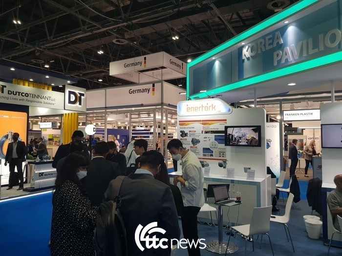 | ▲ 한국물산업협의회는 환경부, 한국수자원공사, 한국환경공단(국가물산업클러스터사업단)과 공동으로 2022년 9월 27일부터 29일까지 두바이 국제 무역 센터에서 개최되는 WETEX & Dubai Solar Show 2022에 참가해 국내 물산업의 중동지역 진출을 지원한다. 사진은 11개의 우수 물기업이 참여한 한국관(사진=한국문산업협의회 제공) |