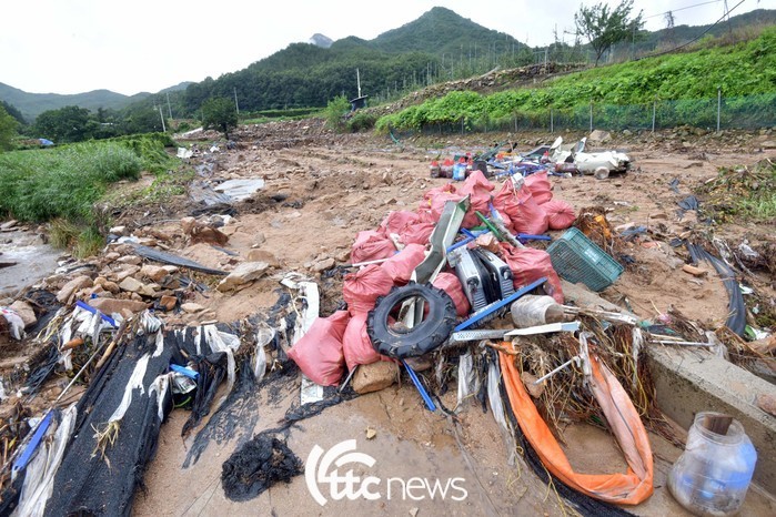 | ▲ 문경시 수평2리 산사태로 마을 전체가 엉망으로 망가졌다. 중장비가 동원되어 물길을 바로 잡고 있다. |