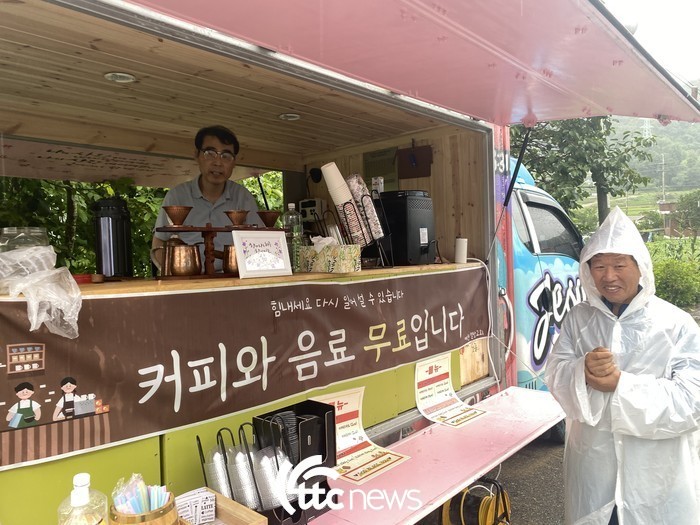| ▲ 백두용(50, 왼쪽)목사는 수재민들과 자원봉사자들을 위해 울산에서부터 푸드트럭을 끌고 벌말리 현장을 찾아 커피와 음료를 무료로 제공하는 봉사활동을 하고 있다. |