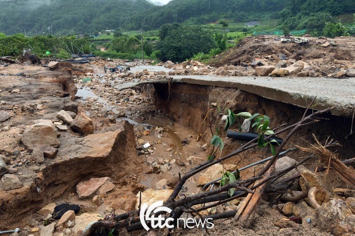 ▲ 마을 진입로등 꼿곳의 도로가 유실되었다. |