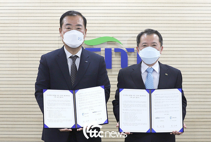 | ▲ 유제철 한국환경산업기술원장(사진 오른쪽)과 하승재 한국물순환협회장이 지난 8일 서울시 은평구 한국환경산업기술원에서 ‘탄소중립 실현을 위한 건전한 물순환체계 구축’ 업무협약을 체결했다.(사진=한국환경산업기술원 제공) |