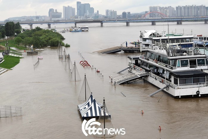 | ▲ 여의도 한강시민공원에 위치한 유람선이 흙탕물 위로 떠 있다. |