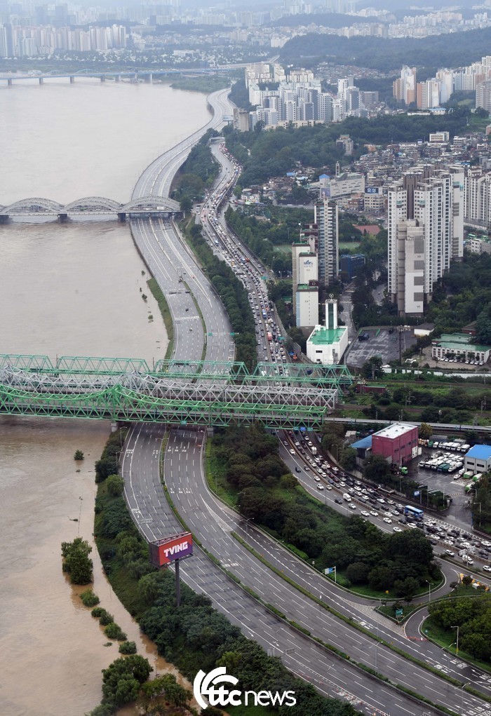 | ▲ 중부지방에 연일 강한 비가 내리고 있는 3일 오후 서울 영등포구 63빌딩 전망대에서 바라본 올림픽대로 일부 구간이 통제되어 있다. 한강 수위가 올라가면서 올림픽대로 염창IC에서 동작대교까지 양방향 모두 통제됐다. |