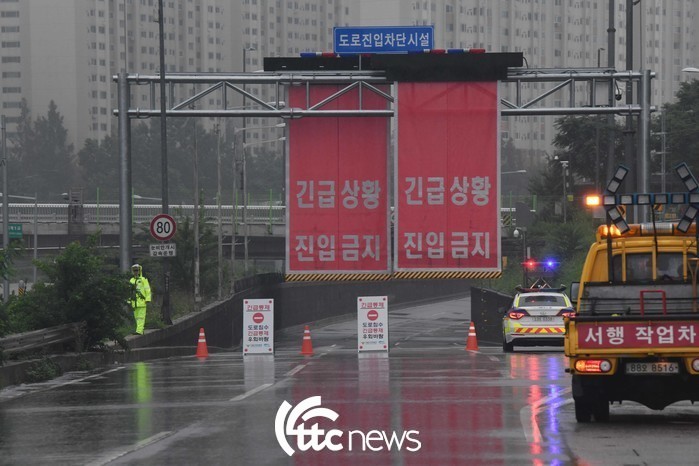 | ▲ 8월들어 사흘간 내린 비로 한강의 수위가 상승하면서 3일 오전 잠수교가 침수됐다.경찰은 이날 잠수교로 내려가는 지하도 등에 폴리스라인을 치고 차량·보행자의 출입을 막으며 현장을 통제 중이다. |