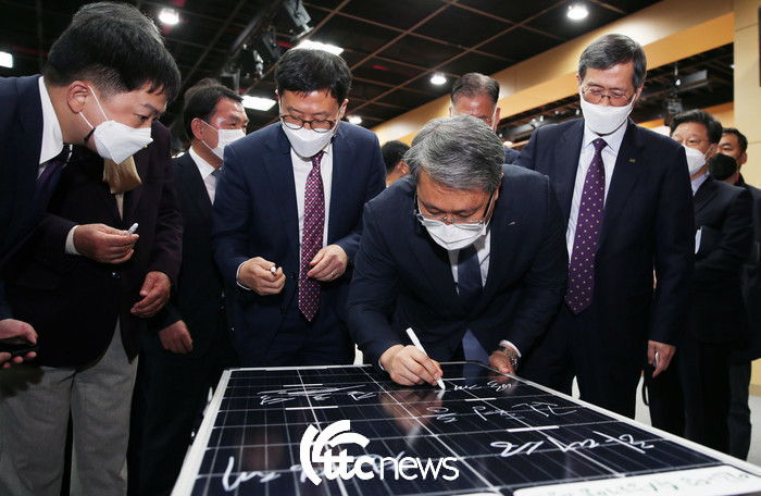 | ▲ 박재현 한국수자원공사 사장이 ‘지역상생 신·재생에너지 확대 보급 및 산업 활성화를 위한 업무협약’에 참석해 태양광 패널 방명록을 작성하고 있다.(사진=한국수자원공사 제공) |