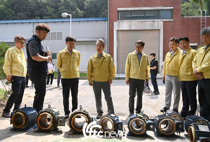 | ▲ 안병옥 한국환경공단 이사장(왼쪽에서 네 번째)은 20일 괴산하수처리장 피해시설 현장을 찾아 피해 현황을 점검하고 있다(사진=한국환경공단 제공) |