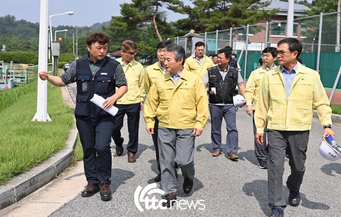 | ▲ 안병옥 한국환경공단 이사장(앞줄 왼쪽에서 두 번째)은 20일 괴산하수처리장 피해시설 현장을 찾아 피해 현황을 점검하고 있다(사진=한국환경공단 제공) |