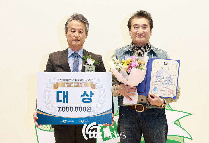 | ▲ 한국환경공단은 17일 국립생물자원관 대강당에서 ‘2023 대한민국 환경사랑공모전’ 수상작 60점에 대한 시상식을 개최했다. 안병옥 한국환경공단 이사장(왼쪽)이 정크아트분야 대상 수상자 최창완 작가와 기념촬영하고 있다(사진=한국환경공단 제공) |