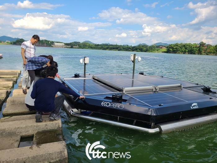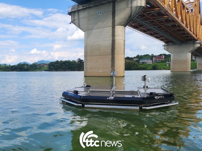 | ▲ AI 자율주행 에코로봇이 6월 22일 경상남도 함안군 칠서면 인근에서 녹조 제거 작업을 진행하고 있다.(사진=한국수자원공사) |