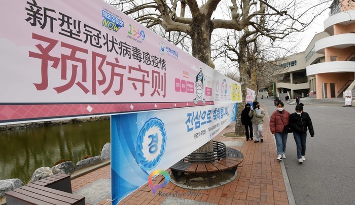 | ▲ 4일 인하대학교 학생회관앞에 설치된 감영예방 안내막 앞을 학생들이 지나고 있다. 개강을 앞둔 대학가에도 신종코로나바이러스감염증으로 비상이 걸렸다. 졸업식 입학식은 물론 신입생OT등 사람이 모이는 행사는 대부분 취소되었다. |