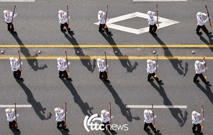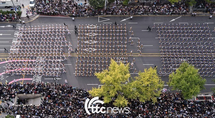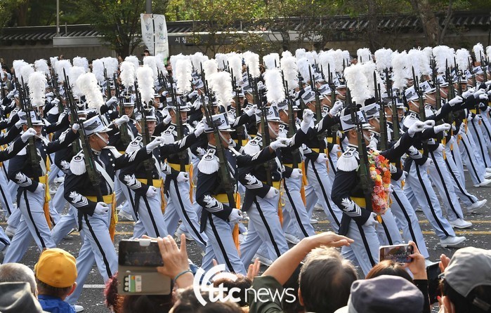 | ▲ 건군 제76주년 국군의 날 시가행진이 열린 1일 서울 세종대로에서 공군 사관학교 생도를 비롯 각 군 사관학교 생도 및 군 장병들의 행진이 이어졌다. |
