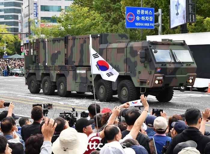 | ▲ 건군 76주년 국군의날 시가행진이 열린 1일 서울 광화문 광장 일대에서 북한이 가장 두려워하는 무기 중 하나인 지대지미사일 현무가 이동하고 있다. 하지만 오전에 열린 공식 기념식에서 최초로 선보인 탄두 중량이 세계 최대인 8t에 달하는 현무-5는 모습을 보이지 않아 시민들은 아쉬움을 나타냈다. 이번에 처음 공개한 현무-5는 북한 지휘부가 은신한 지하 벙커를 파괴하는 초고위력 탄도미사일이다. |