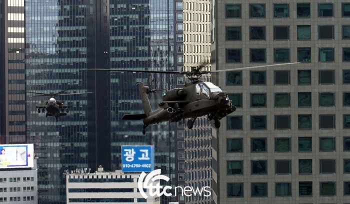 | ▲ 광화문 일대 세종대로에서 펼쳐진 제76주년 국군의 날 시가행진에서 행진대열 위로 아파치헬기가 비행을 하고 있다 |