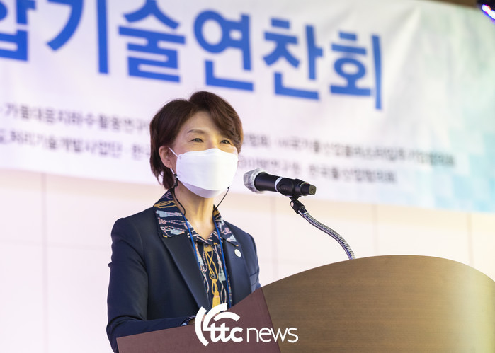| ▲ 한정애 환경부장관이 축사를 통해 국내 물산업을 탄소중립과 그린뉴딜을 이끌 미래 핵심 산업으로 세계적인 경쟁력을 갖출 수 있도록 지원을 아끼지 않겠다”라고 밝혔다. |