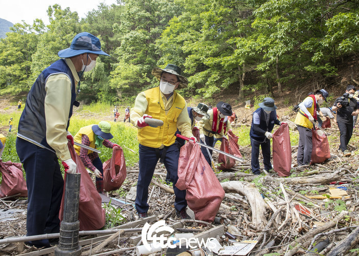 | ▲ 홍정기 환경부 차관(앞줄 왼쪽 두 번째)이 지난해 6월 충북 옥천군 대청댐 인근 하천변에서 장마철 대비 쓰레기 집중정화주간을 맞아 사회적협동조합 금강 조합원들과 함께 쓰레기 수거활동을 하고 있다. (자료사진=환경부 제공) |