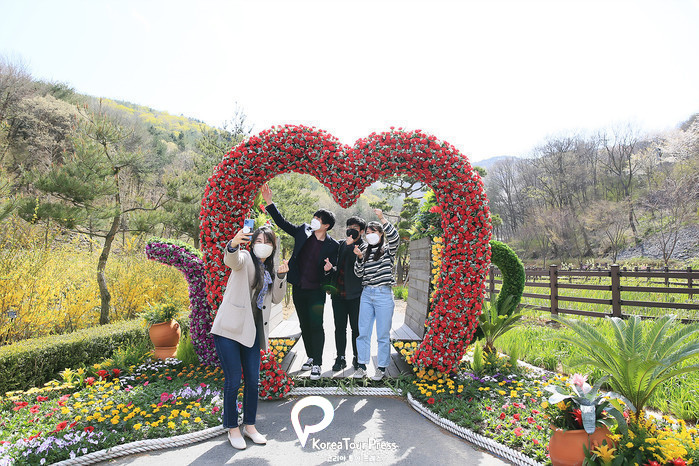 ▲ 23일 충남 보령시 무궁화수목원을 찾은 시민들이 하트꽃 장식을 배경으로 사진을 찍고 있다. 보령시는 코로나19 확산으로 운영을 중단했던 성주산자연휴양림 등 산림휴양시설과 야외 체육시설을 22일부터 제한적으로 운영을 재개한다고 밝혔다. (사진=보령시 제공) |