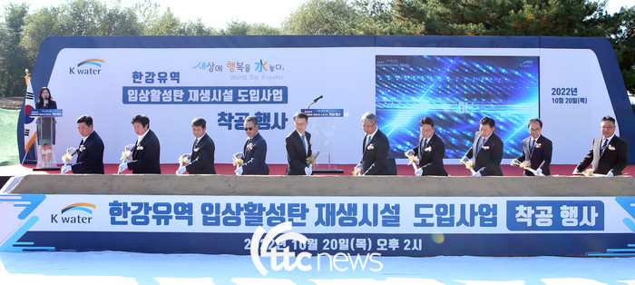 | ▲ 수자원공사는 20일 경기도 남양주시 한국수자원공사 덕소정수장에서 국내 최대규모로 설치되는 입상활성탄 재생시설의 착공행사를 개최했다. 한국수자원공사는 이번 사업을 시작으로 활성탄 교체 방식을 신탄 구매방식에서 기존 활성탄 재생방식으로 전환할 계획이다. 착공식에 참석한 박재현 한국수자원공사 사장(사진의 오른쪽에서 다섯 번째)과 관계자들이 첫 삽을 뜨고 있다.(사진=한국수자원공사 제공) |