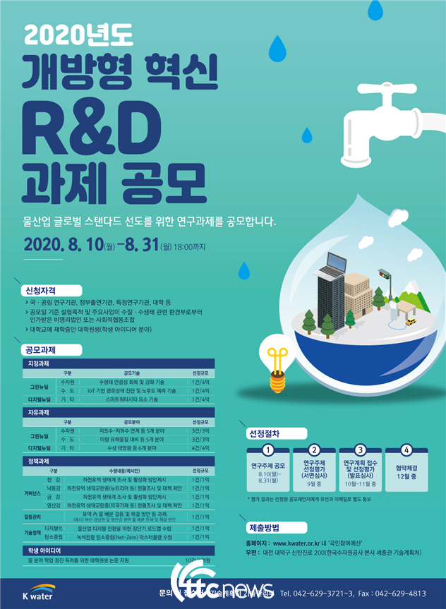 | ▲ 수자원공사는 외부의 창의·혁신적인 기술도입과 시민참여형 연구개발을 위한 개방형 연구개발 지원을 위한 개방형 혁신 R&D를 국내대학, 학회, 민간·공공연구기관, 시민사회단체 등을 대상으로 8월 31일까지 공모한다. |