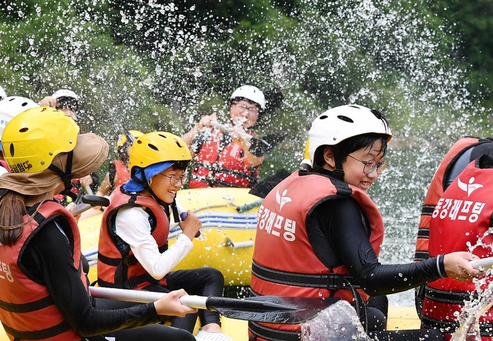 안전장비 착용과 안전교육을 마친 체험객들이 준비운동으로 몸을 풀고 노란 고무보트에 올라탄다. 처음 래프팅에 나선 어린이의 표정이 다부지다.