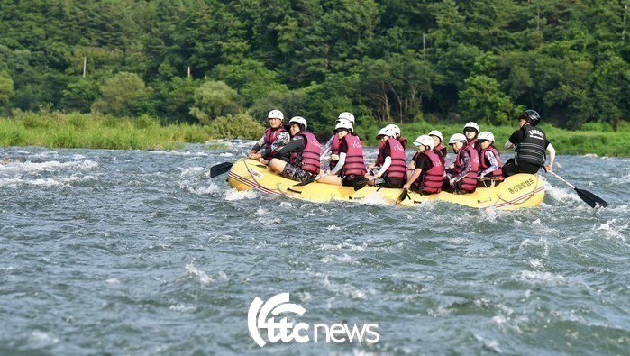 “이제부터 본격적으로 래프팅을 시작 하도록 하겠습니다. 오늘은 래프팅하기에 딱 좋은 날입니다. 지난주까지 이어진 장마로 수량도 풍부해 2시간 반 ~ 3시간 정도가 소요될 예정입니다.”