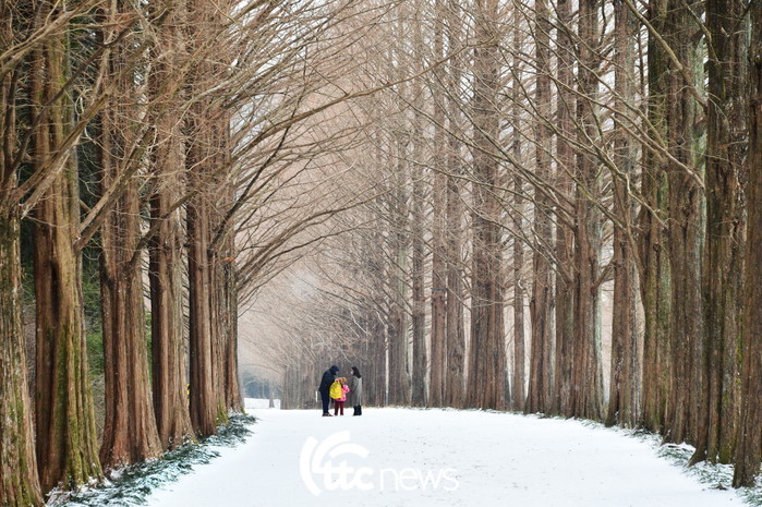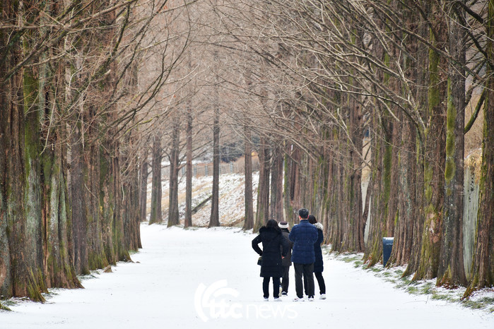 | ▲ 17일 가는 겨울을 아쉬워하듯 눈이 내린 전남 담양 메타세쿼이아 길을 찾은 관광객들이 아름다운 설경을 즐기고 있다.(사진=담양군 제공) |