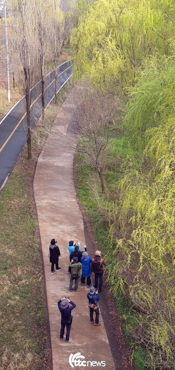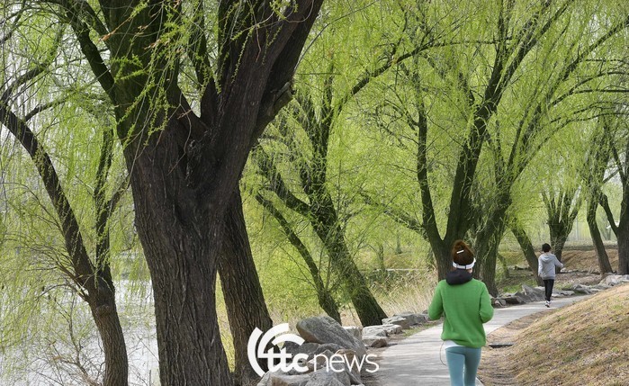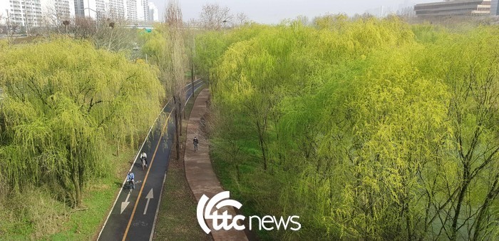 | ▲ 봄바람에 너울거리며 연초록 물결을 이룬 여의샛강생태공원 버드나무 군락 옆 자전거 전용도로에 시민들이 봄향기를 호흡하며 라이딩을 즐기고 있다. |