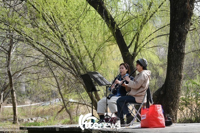 | ▲ 따사로운 봄 햇살과 적당히 시원한 강바람, 강변을 따라 줄지어선 버드나무의 화사한 연두빛을 만날 수 있는 한강변과 여의샛강생태공원은 최고의 봄나들이 코스이다. 봄바람에 너울거리는 버드나무 아래서 클라리넷을 연주하는 시민 |