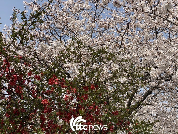 | ▲ 여의 샛강생태공원 입구 윤중로에 벚꽃이 만개하고 그 아래 명자나무가 붉을 꽃을 피웠다. |