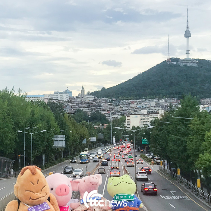 | ▲ 이태원 녹사평육교에서 남산을 배경으로 기념촬영하는 캐릭터인형 방한여행단(사진=한국관광공사 제공) |