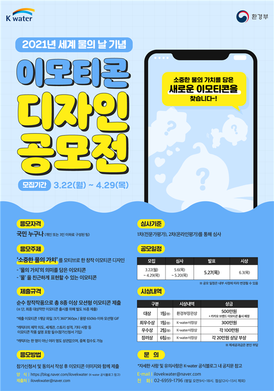 수자원공사가 개최하는 이번 공모에는 국민 누구나 개인 또는 3인 이내의 팀을 이뤄 참여할 수 있다. 참여 방법은 ‘소중한 물의 가치’를 모티브로 제작한 총 8종 이상의 모션형 이모티콘(gif 파일)을 참가신청서와 함께 전자우편(ilovekwater@naver.com)으로 접수하면 된다.