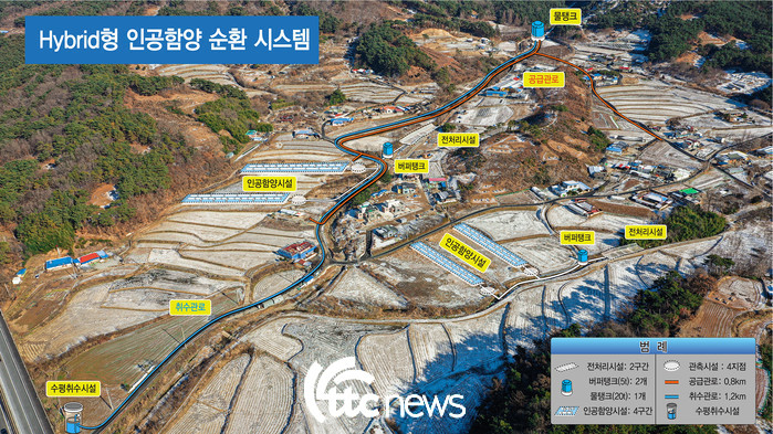 | ▲ 가뭄 발생 시마다 지하수 난 개발로 인한 경제적 손실 및 지하수자원 고갈 방지를 위해 지역 맞춤형 용수 공급 체계를 확보할 수 있는 지하수 인공함양 기술이 개발되어 물 복지 사각지대에 안정적으로 용수를 확보 공급할 수 있는 기술이 개발되었다. (하이브리드형 인공함양 순환시스템 체계도=한국환경산업기술원 제공) |