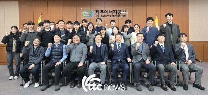 | ▲ 제주에너지공사(사징 김호민)는 인천환경공단 최계운 이사장를 초청해 순환경제사회로의 전환과 환경에너지사업 발굴을 위한 기술교류회를 진행했다. 김호민 제주에너지공사 사장(앞줄 왼쪽에서 네번째)와 최계운 이사장(다섯번째)이 제주에너지공사 관계자들과 기념사진을 촬영하고 있다.(사진=제주에너지공사 제공) |