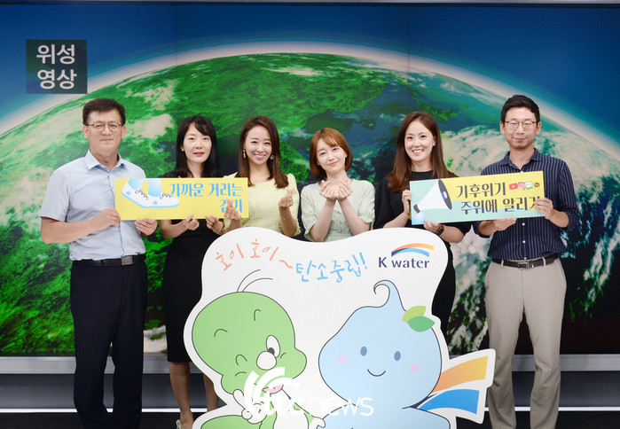 수자원공사는 지난 29일 KBS재난미디어센터에서 기상캐스터와 기상전문기자 등 6명과 함께 ’생활 속 탄소중립 캠페인‘을 열었다고 1일 밝혔다. 이날 강아랑, 노은지, 오수진 기상캐스터와 김성한, 신방실, 이정훈 기상전문기자는 수자원공사 캐릭터인 방울이와 둘리 포토존에서 ‘생활 속 탄소중립 실천’을 외치면서 사진을 촬영했다.