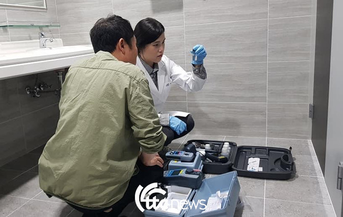 | ▲ 수자원공사 제주지사 기술진이 개학을 앞둔 고등학교 화장실 수도꼭지의 수돗물 수질검사를 현장에서 진행하고 있다(사진=K-water제주지사 제공) |