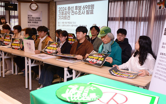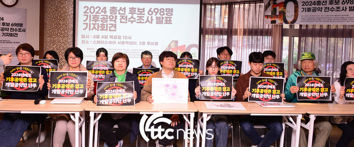 | ▲ 기후정치바람 등 국내 16개 기후·시민단체는 4일 서울 중구 스페이스쉐어 서울역센터 회의실에서 전국 254개 선거구에 출마한 지역구 후보자 696명의 기후 공약을 전수 조사한 결과를 발표 했다. |