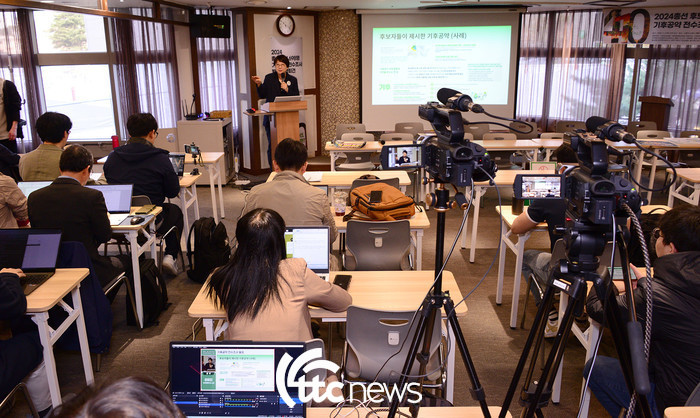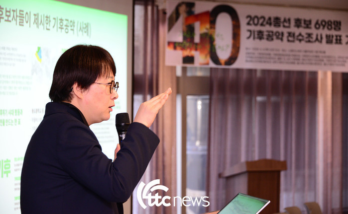 | ▲ 이유진 녹색전환연구소장이 4일 서울 중구 스페이스쉐어 서울역센터 회의실에서 전국 254개 선거구에 출마한 지역구 후보자 696명의 기후 공약을 전수 조사한 결과를 기자들에게 설명하고 있다. |