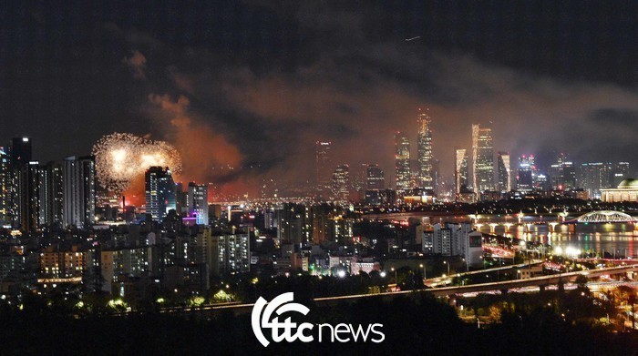 빨간 꽃 노란 꽃... 3년 만에 한강에 불꽃이 타 올랐다. 어둠이 깃든 가을밤 한강 하상에서 한 줄기 빛이 서울의 마천루 사이로 솟아오르고 주변에는 '와-'하는 탄성이 터진다.