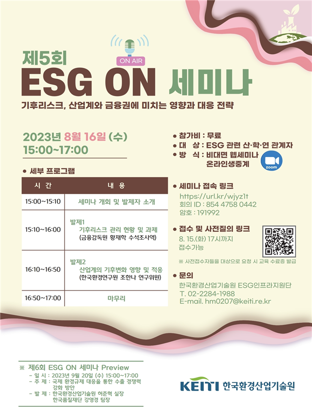 한국환경산업기술원(원장 최흥진)은 16일 오후 3시 비대면 웹세미나 형식으로 다섯 번째 ‘ESG ON 세미나’를 열고 기후위험(기후리스크)이 산업계와 금융권에 미치는 영향과 이에 대응하는 전략을 주제로 의견을 나눈다.