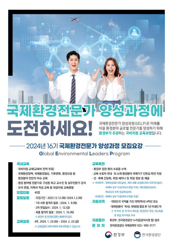 한국환경공단은 ‘2024년 국제환경전문가 양성과정’ 교육생을 ‘23년 12월 12일부터 ’24년 1월 2일까지 모집한다고 밝혔다.
