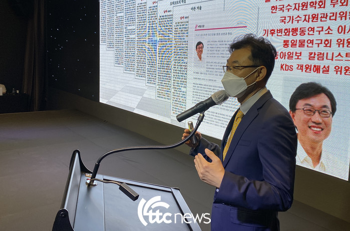 ▲ 한국물학술단체연합회(회장 민경석)가 11일 영등포구 여의도동 글래드호텔에서 개최한「공유하천 공동관리를 통한 남북협력방안 세미나」에서 장석환 대진대학교 건설시스템공학과 교수(사진)이 공유하천을 통한 남북 상생 협력 방안을 발제하고 있다. 장 교수는 “유역내 근본적인 홍수예방과 물이용은 남북협력 만으로도 가능한 문제이다.”라며, “공유하천 흘러야 통일이 가까워진다.”라고 말했다.