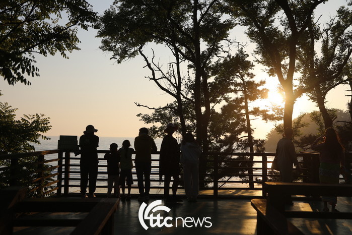 | ▲ 천리포 바닷가 수목원 전망대에서 노을을 즐기는 탐방객(사진=천리포수목원 제공) |