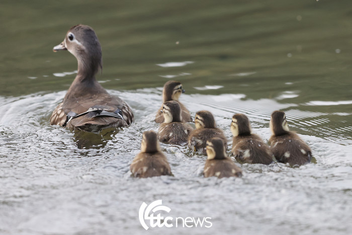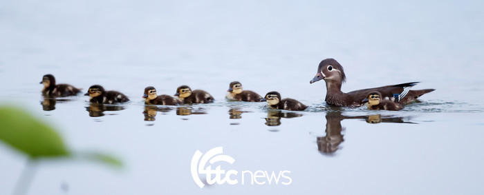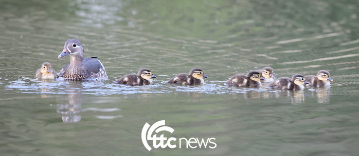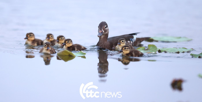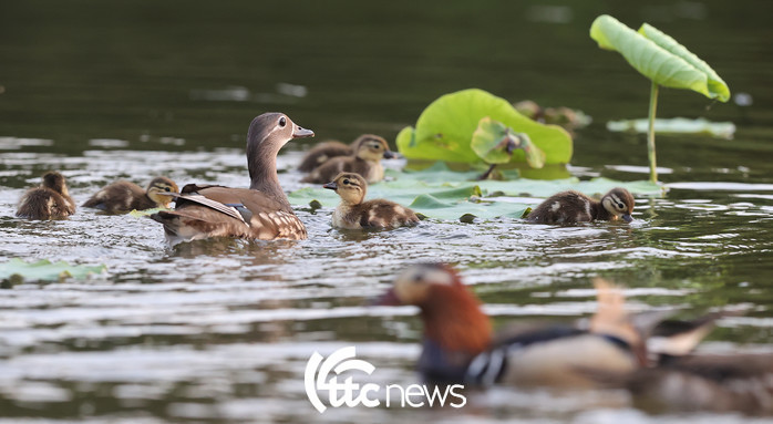 | ▲ 26일 경남 함양군 함양읍 상림공원 연꽃단지에서 천연기념물 제327호인 원앙이 갓 부화한 어린 원앙과 함께 물살을 가르며 유영하고 있다(사진=함양군 김용만 주무관 제공) |