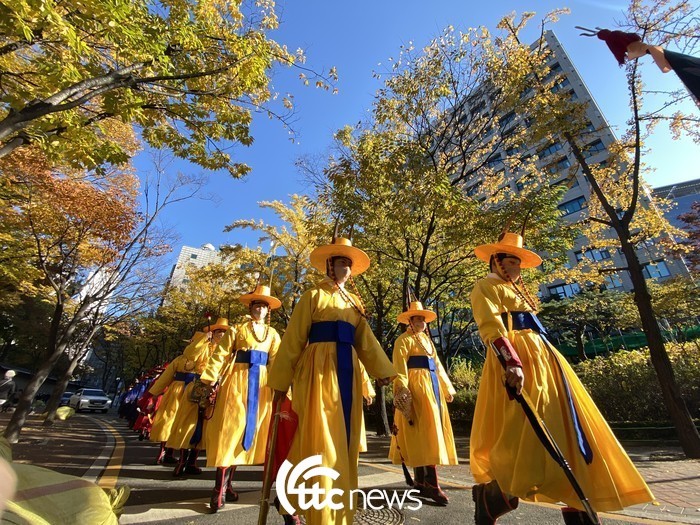 | ▲ 문화재청은 도심 속 궁궐과 조선왕릉을 단풍을 구경할 수 있는 최적의 장소로 추천한다. 왕궁수문장 교대의식을 마친 수문군들이 4일 오후 가을 정취 가득한 덕수궁 돌담길을 따라 순라행렬을 벌이고 있다. |