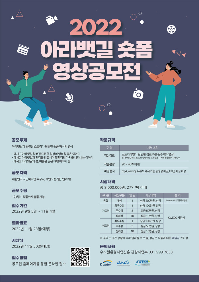 K-water 아라뱃길지사와 수자원환경산업진흥(주)은 ‘2022년 아라뱃길 숏폼 영상 공모전’ 작품을 공모한다고 8일 밝혔다.