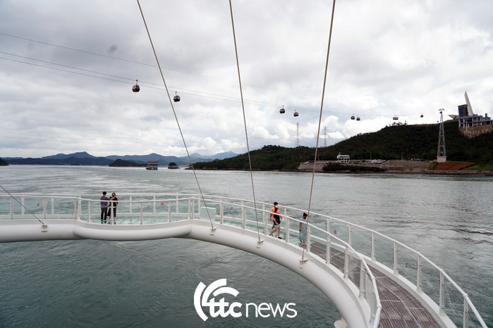 | ▲ 해남군은 3일 우수영 관광지에 스카이워크와 해상케이블카를 개통했다. 총길이 110m의 울돌목 스카이워크는 울돌목의 거센 물살 위를 직접 걸어볼 수 있도록 조성됐다. 바다 쪽으로 직선거리 32m까지 돌출되고, 바닥을 투명 유리로 만들어 스릴감을 극대화하고 있다.(사진=해남군 제공) |