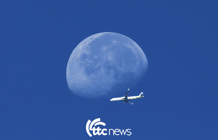 26일 아침 전남 강진군 강진읍에서 올려다 본 쪽빛하늘에 기우는 달 아래로 비행기가 지나가며 멋진 가을 정취를 연출하고 있다.